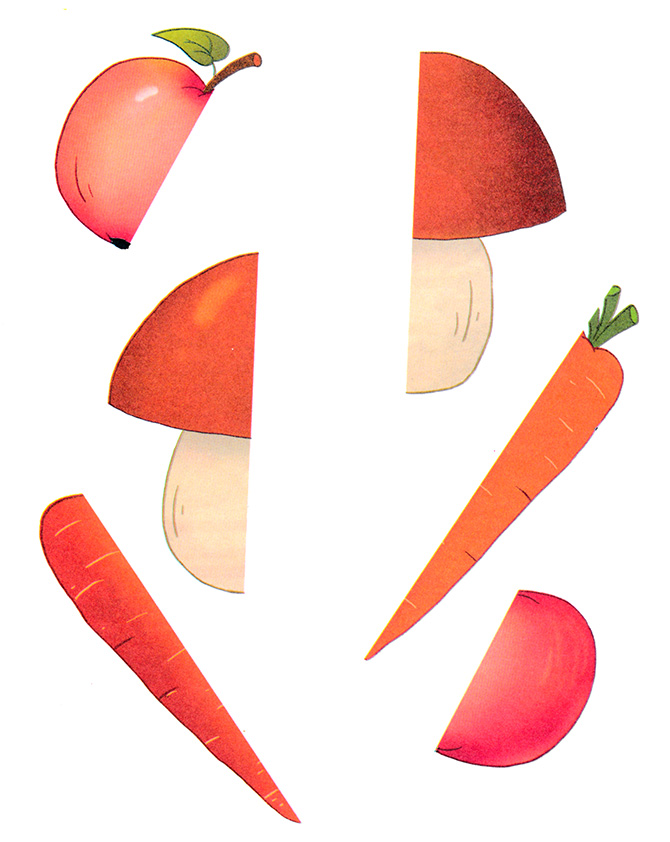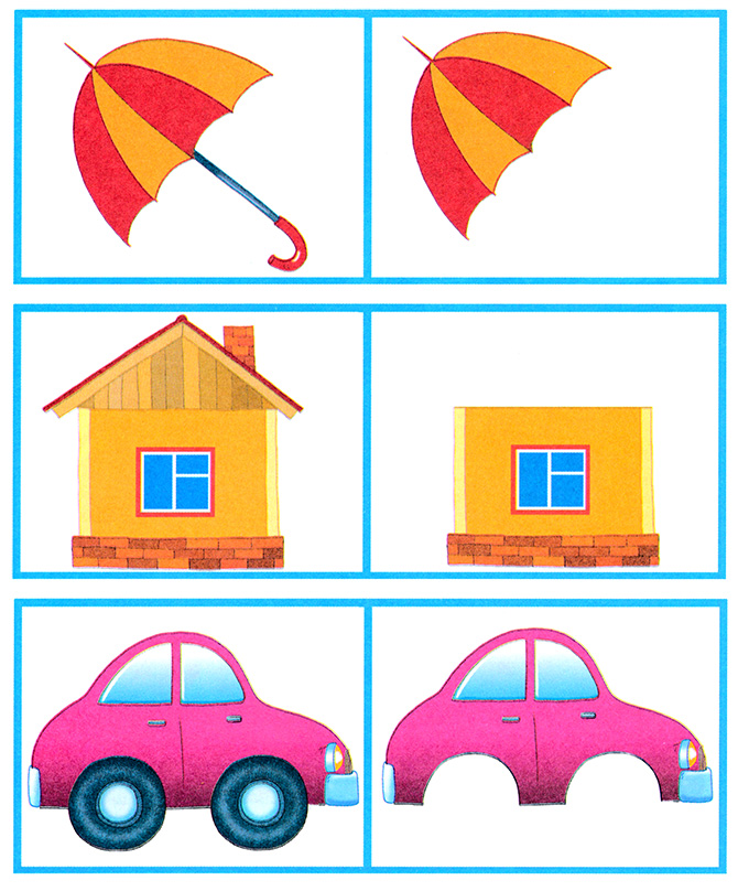 Картинки перерезали пополам. Найди половинки и назови предметы.