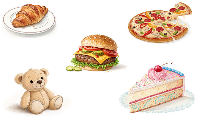 Ответ: Лишний предмет – плюшевый мишка (игрушка), так как всё остальное – это еда.