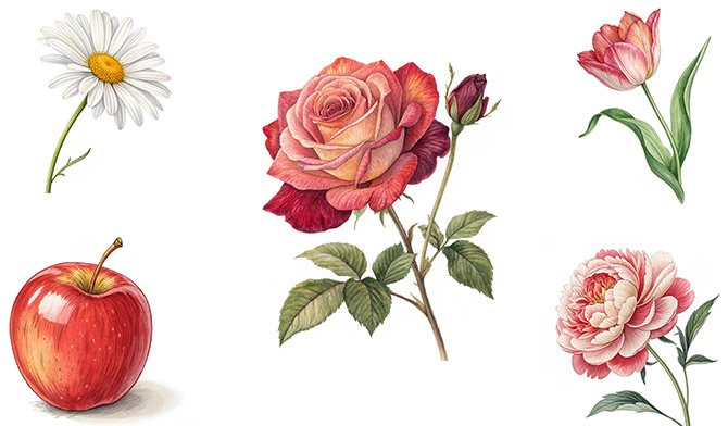 Ответ: Лишнее яблоко – фрукт, так как всё остальное – цветы.